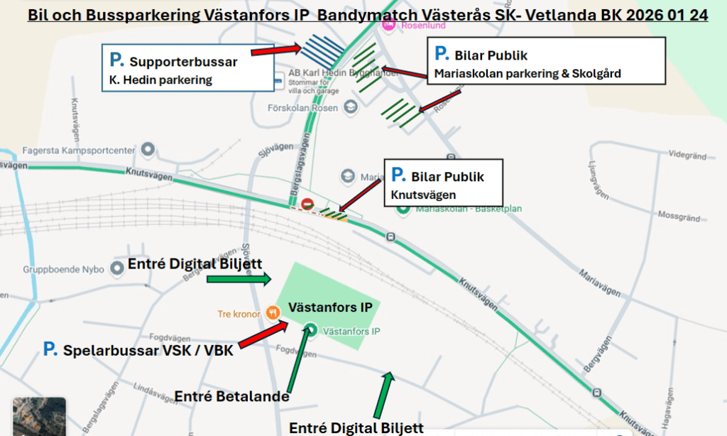 Ta Riksväg 66 mot Fagersta. Det är gatuparkering på gatorna runt Västanfors IP, vilket gör att det finns ont om parkeringsplatser. Vi hänvisar istället till VSK Sports bussar eller tåg. Det finns även möjlighet att parkera vid Mariaskolan, se bilden nedan. Om du tar bil, se till att åka i tid.